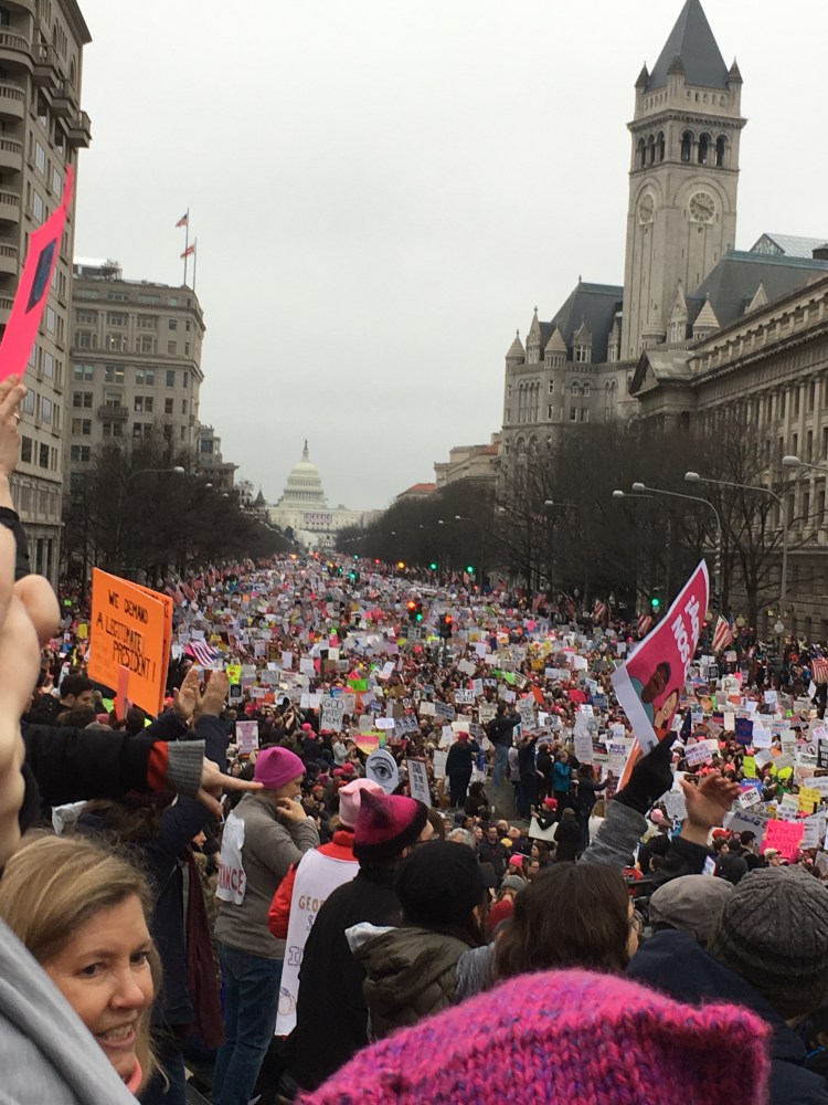 I don’t know the count yet, but it has got to have been over 500,000. Men, women, children, LGBTQ young, old, people of all color. I don’t know what the media is saying about yesterday- but there was barely anyone here for Trump. It was pink hats everywhere.